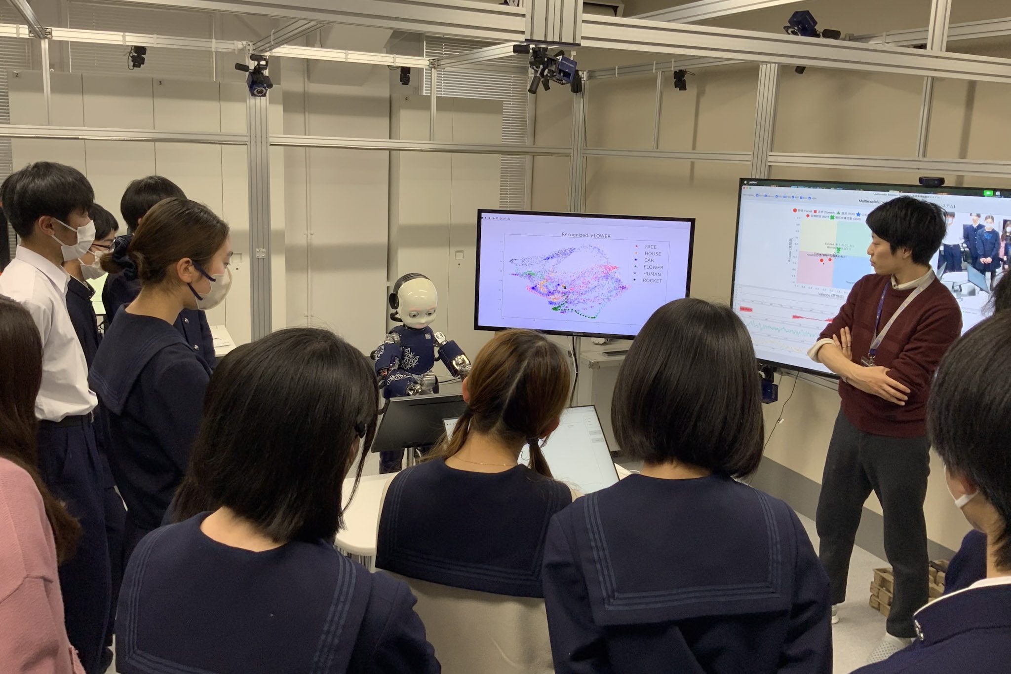 長井志江研究室では、認知発達ロボティクス研究を紹介しました。生体情報を用いた感情推定やニューラルネットワークを活用したロボット実験を体験したほか、自閉スペクトラム症の知覚体験シミュレータを通じて、最先端の研究に触れていただきました。