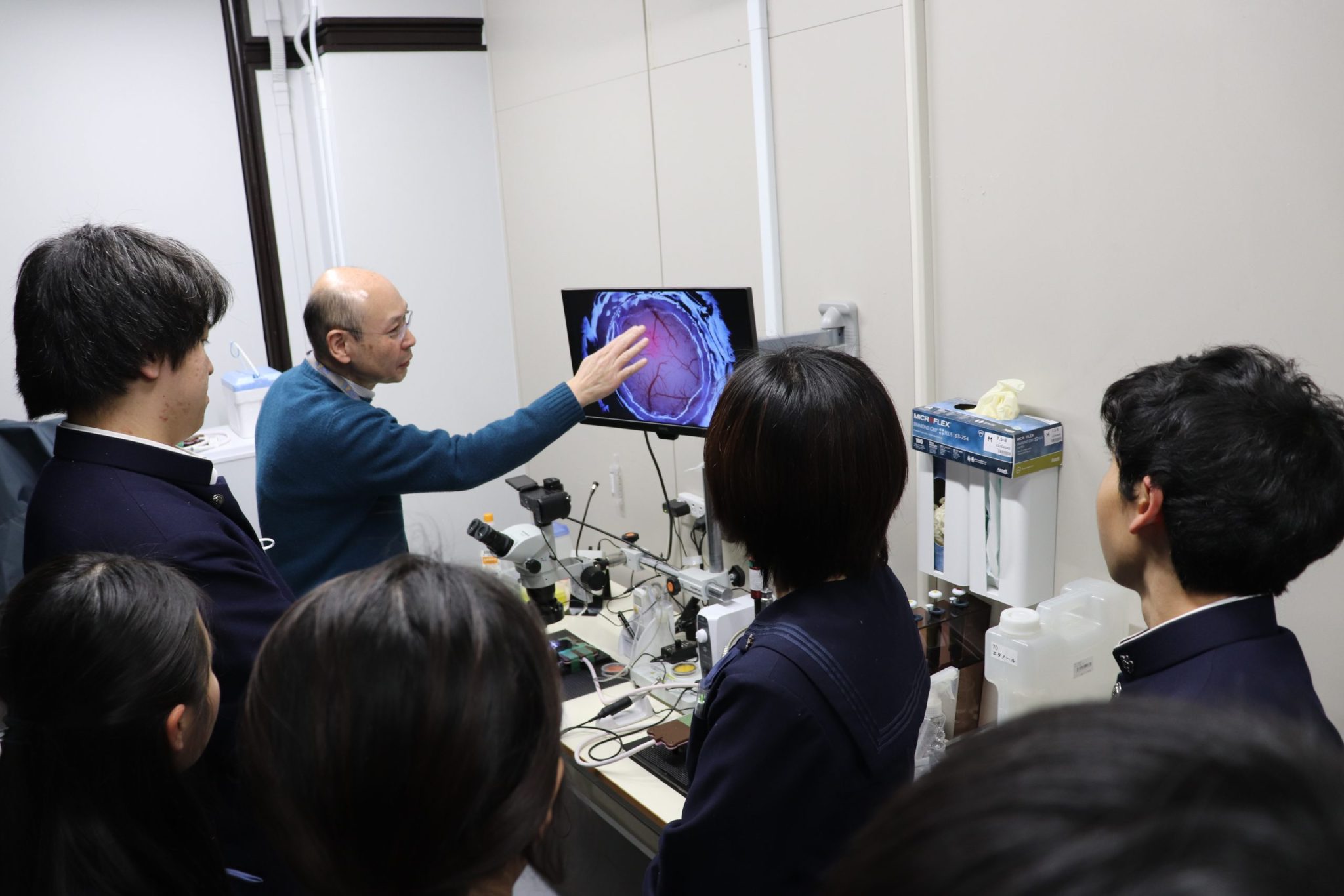 講演後、生徒たちは3グループに分かれ、それぞれの研究現場を見学しました。