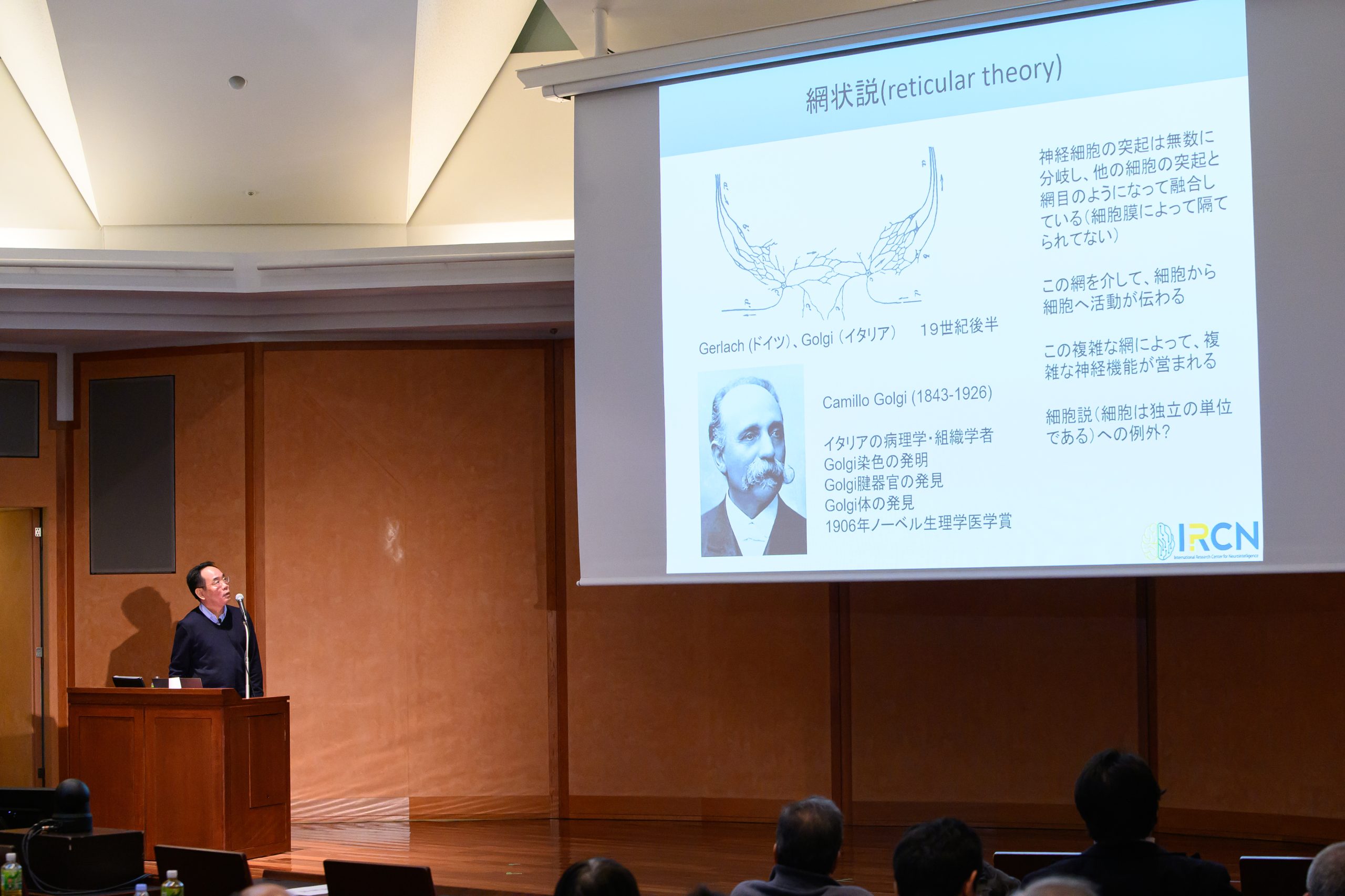 本講演会では、宇宙・生命・知性の起源をテーマに、各分野の最先端研究が紹介されました。IRCNからは大木研一副機構長・教授が登壇し、「人工知能の始まり―脳から人工知能へ」と題して講演を行いました。人間の脳を模した機械を作るという問いから始まった人工知能研究の歴史を、神経回路の仕組みや情報処理の観点から概観するとともに、近年の生成AIの進展に至る流れを紹介しました。さらに、こうした技術の発展が「知能とは何か」「理解とは何か」といった根源的な問いを改めて提起している点について紹介しました。